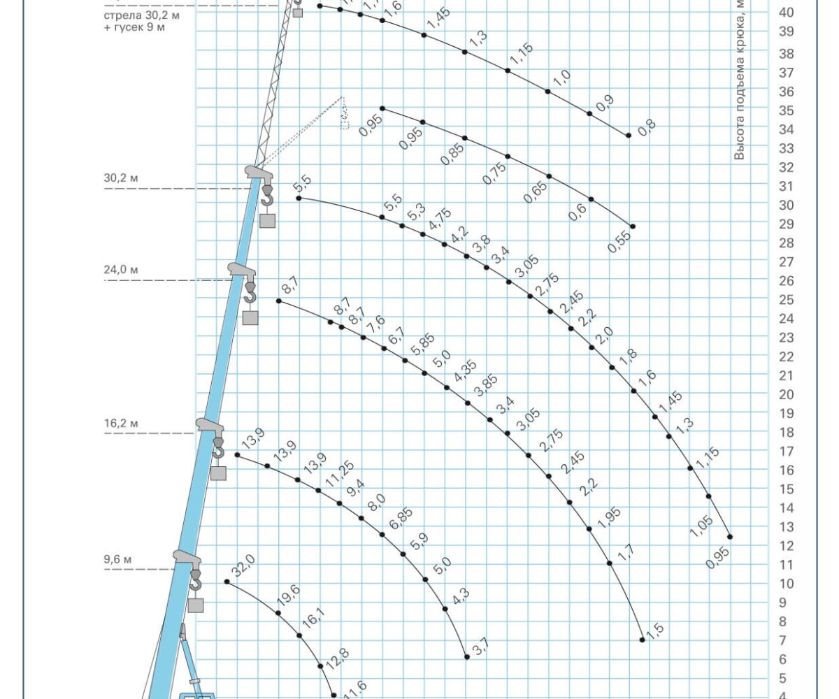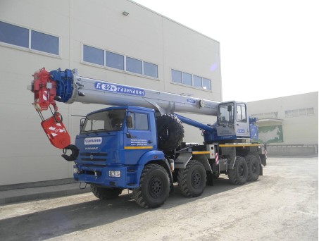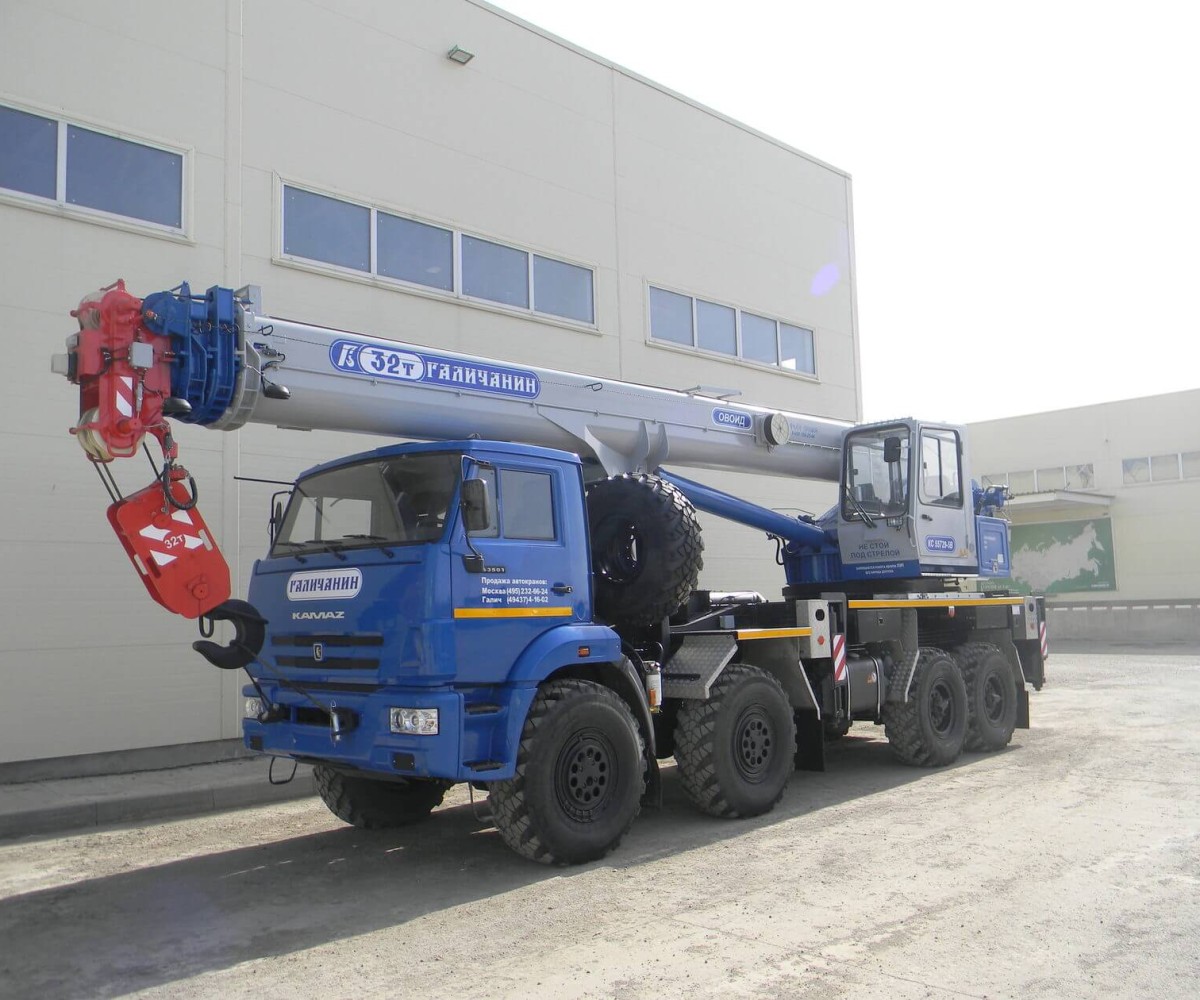 Данная модель способна проводить работы в самых труднодоступных местах, так как она монтирована вездеходным шасси КАМАЗ и все 8 колес является приводными. Галичанин 32т вездеход будет востребован в условиях бездорожья, а также на неподготовленных строительных площадках. Стрела от Галичского завода грузоподъемностью до 32 тонн позволяет поднимать особо тяжелые грузы,а ее вылет в 30.2 метров позволяет использовать данный автокран для монтажных работ на высоте и на большом расстоянии от центральной оси.